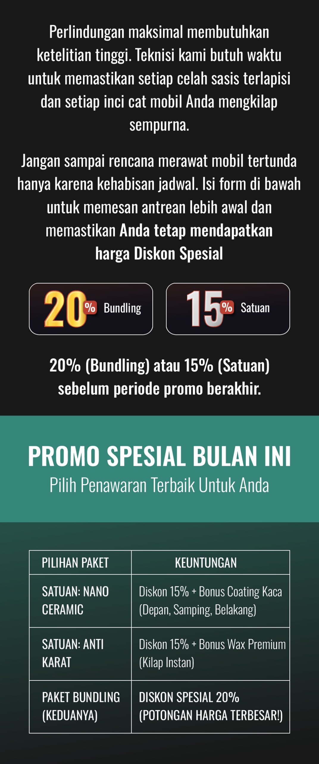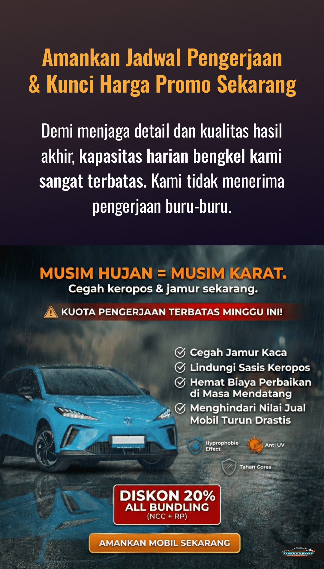 2. Cek Harga Pasti & Transparan Kami bantu hitung total biaya net sesuai ukuran mobil Anda sekarang. Dijamin harga fix di awal, tanpa ada biaya tambahan tersembunyi di bengkel..